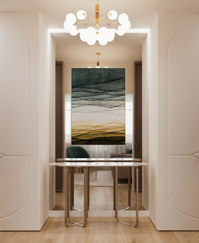При создании этого интерьера, наши заказчики выразили желание получить светлое и просторное пространство, но в то же время с ноткой изысканности. Мы приняли это желание как отправную точку для создания интерьера, который бы сочетал в себе легкость и элегантность. Одной из ключевых составляющих этой концепции стала цветовая гамма стен. Мы решили оставить стены светлыми и нейтральными, чтобы создать иллюзию бескрайности. Мягкие разбеленные цвета стали идеальным фоном, подчеркивающим свет и прозрачность интерьера. Однако, чтобы добавить интерьеру глубины, мы выбрали кофейный оттенок для отделки мебели. Кофейные акценты придают мебели особую плотность и приковывают внимание к деталям. Также в этом интерьере нашлось место зелени. Зеленые акценты в качестве обоев и кухонных фасадов добавляют свежесть в пространство. В результате получилось уникальная квартира, где каждая деталь подчеркивает характер и вкусы его обитателей.